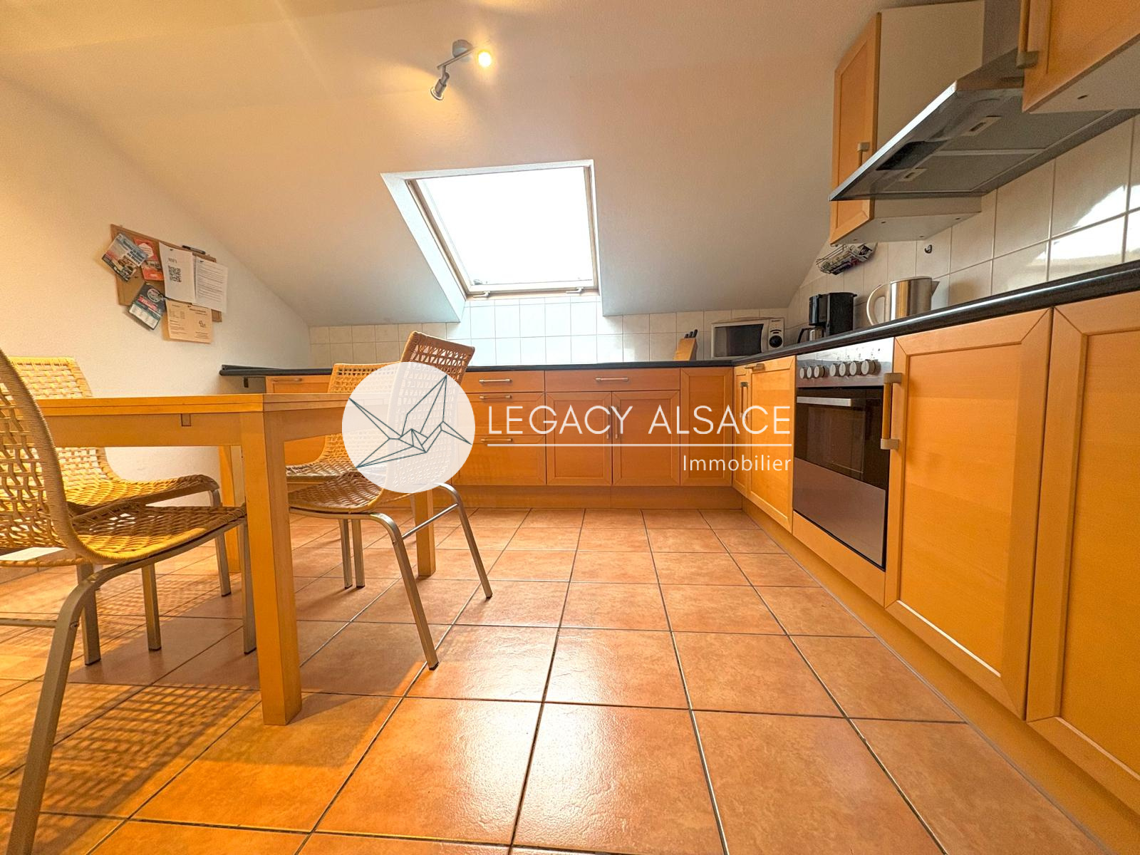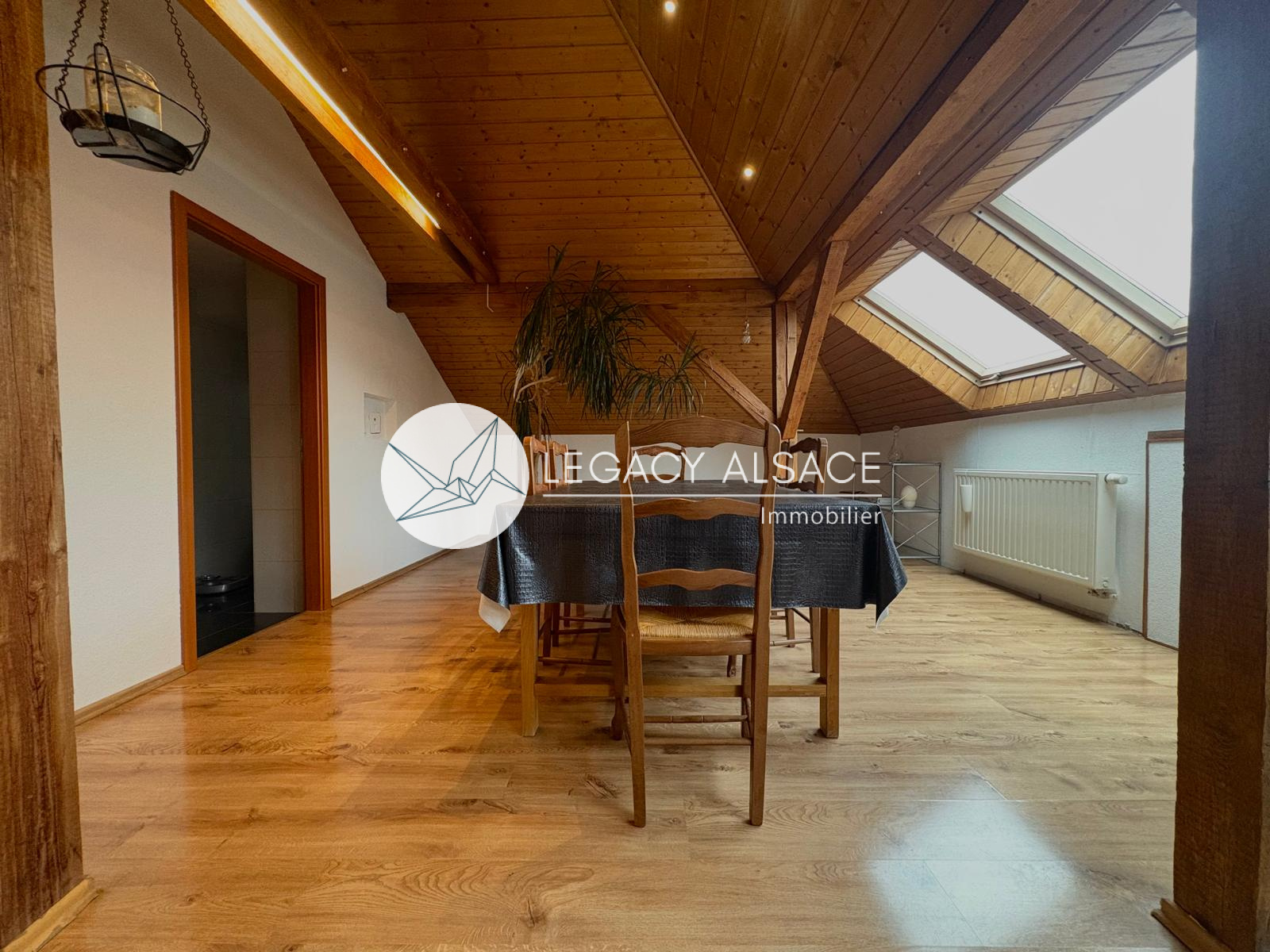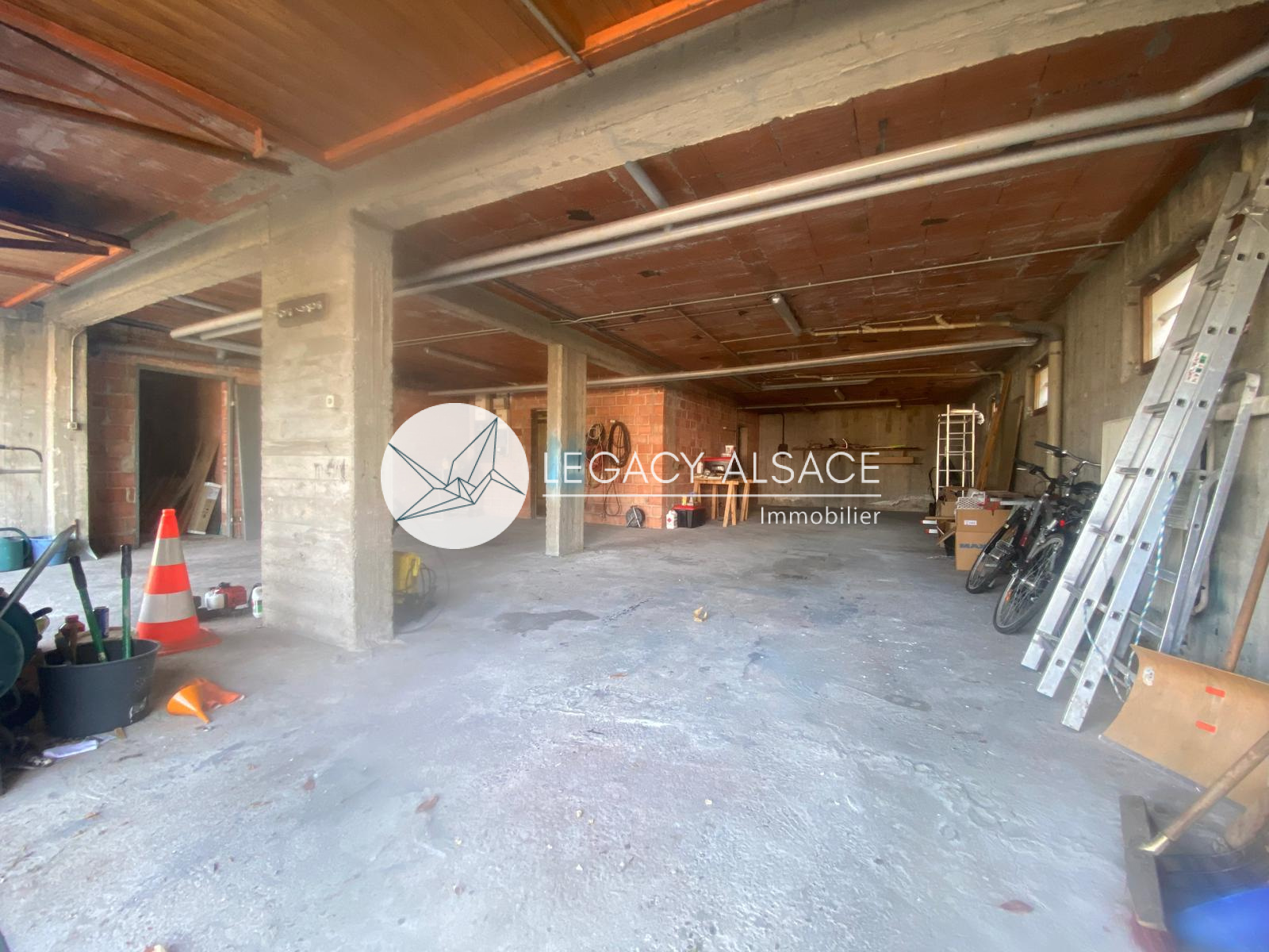 Le grand sous-sol, sec et bien conçu, permet d’envisager l’aménagement d’un troisième appartement grâce à une salle d’eau avec WC déjà en place. Le garage peut accueillir 4 à 5 véhicules et bénéficie d’un avantage technique rare : les tuyaux et câbles électriques sont posés ouvertement au plafond, facilitant l’entretien et les raccordements vers les étages. La maison est chauffée au gaz et la taxe foncière s’élève à environ 1200 €. À l’extérieur, quatre places de stationnement complètent le bien. Accès direct en train vers Strasbourg (40 min), ainsi que vers Weissenburg, Kandel, Karlsruhe ou Baden-Baden.