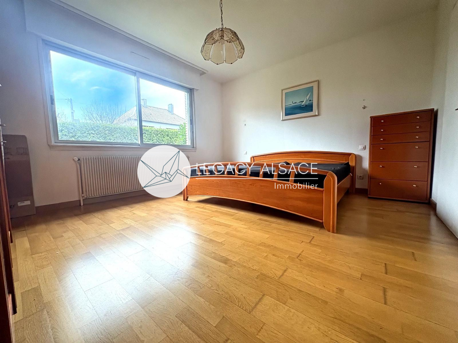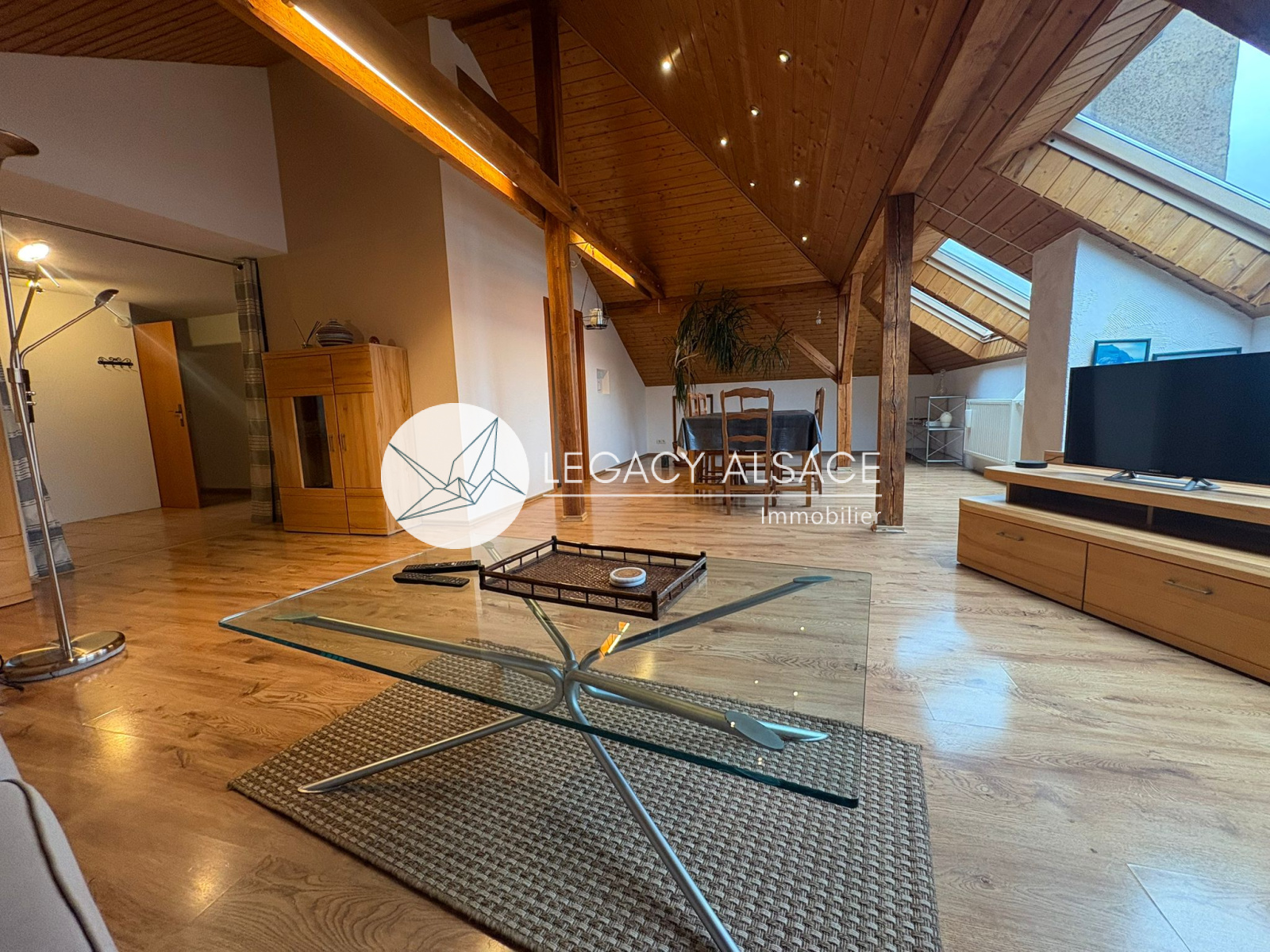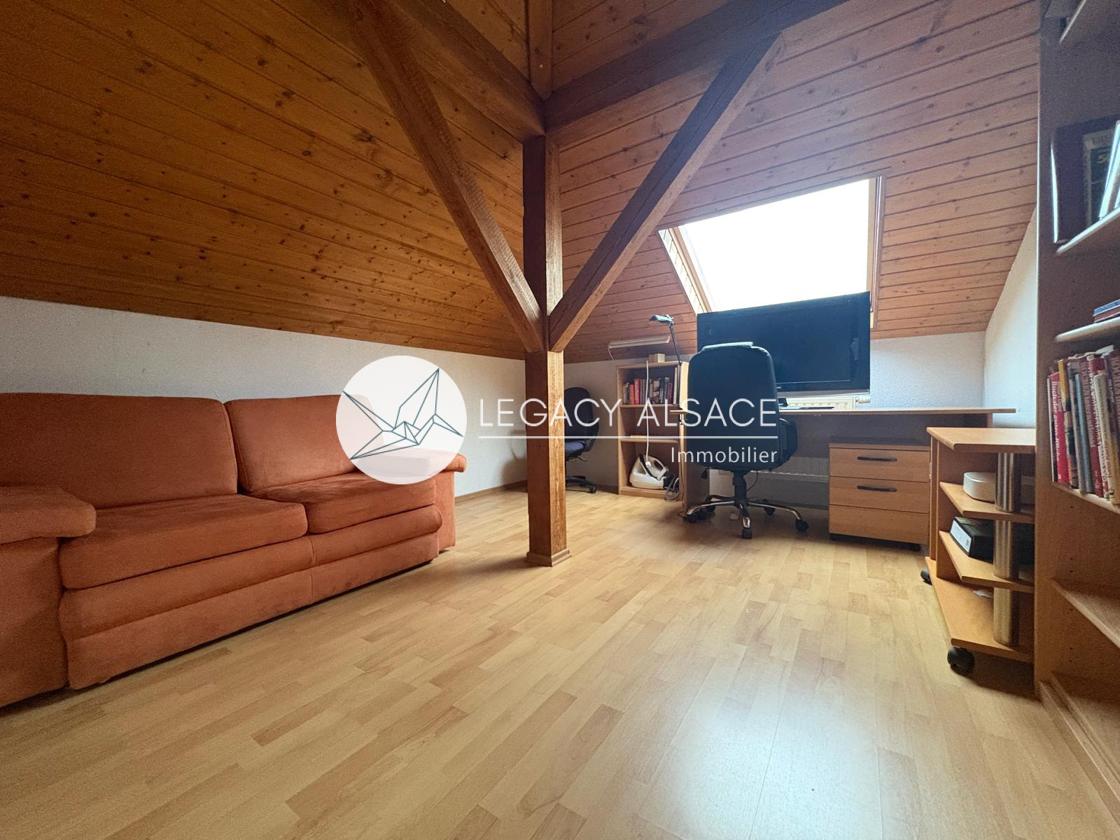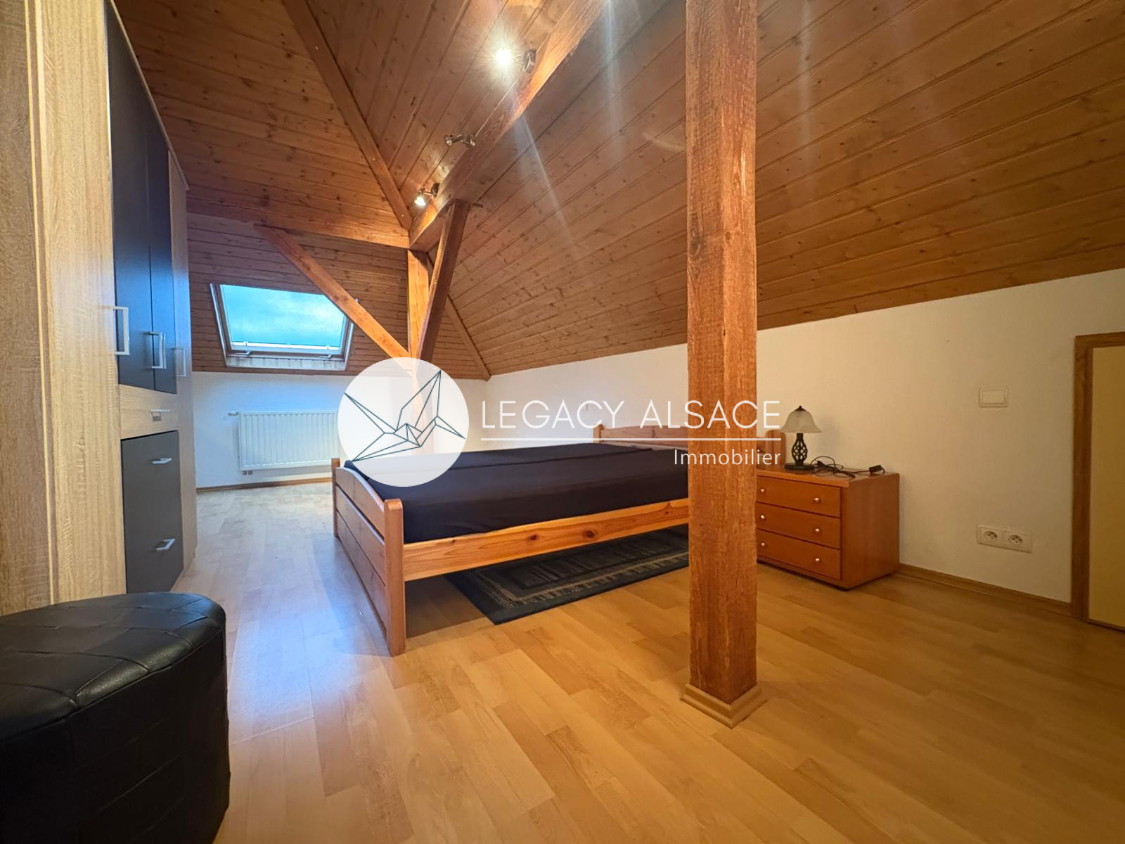 Le grand sous-sol, sec et bien conçu, permet d’envisager l’aménagement d’un troisième appartement grâce à une salle d’eau avec WC déjà en place. Le garage peut accueillir 4 à 5 véhicules et bénéficie d’un avantage technique rare : les tuyaux et câbles électriques sont posés ouvertement au plafond, facilitant l’entretien et les raccordements vers les étages. La maison est chauffée au gaz et la taxe foncière s’élève à environ 1200 €. À l’extérieur, quatre places de stationnement complètent le bien. Accès direct en train vers Strasbourg (40 min), ainsi que vers Weissenburg, Kandel, Karlsruhe ou Baden-Baden.